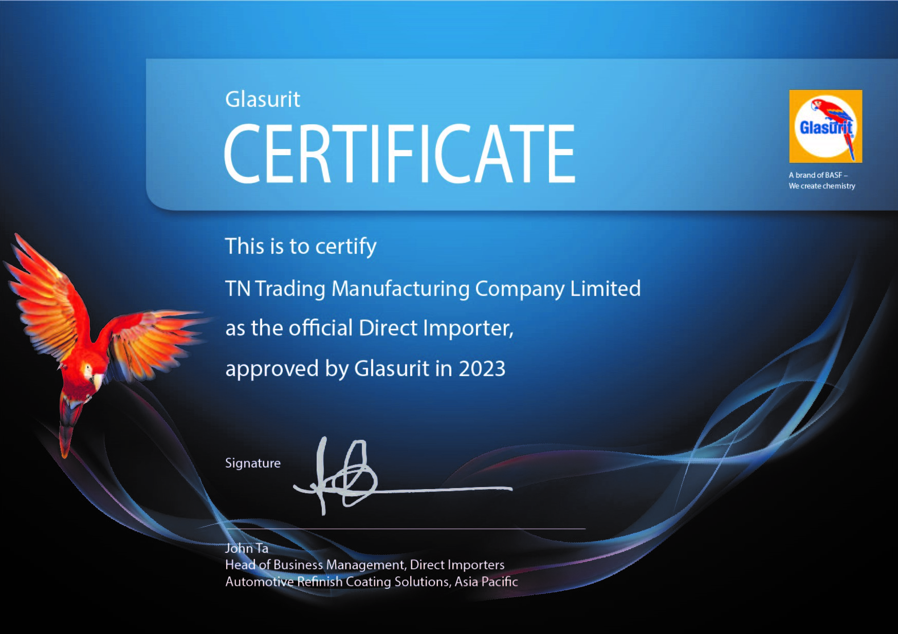Năm 2023, công ty TNHH sản xuất thương mại TN (Glasurit Việt Nam) vinh dự và tự hào trở thành nhà nhập khẩu và phân phối độc quyền Glasurit tại Việt Nam – thương hiệu sơn ô tô đứng đầu thế giới về chất lượng và công nghệ, có lịch sử hơn 130 năm từ tập đoàn BASF của Đức.