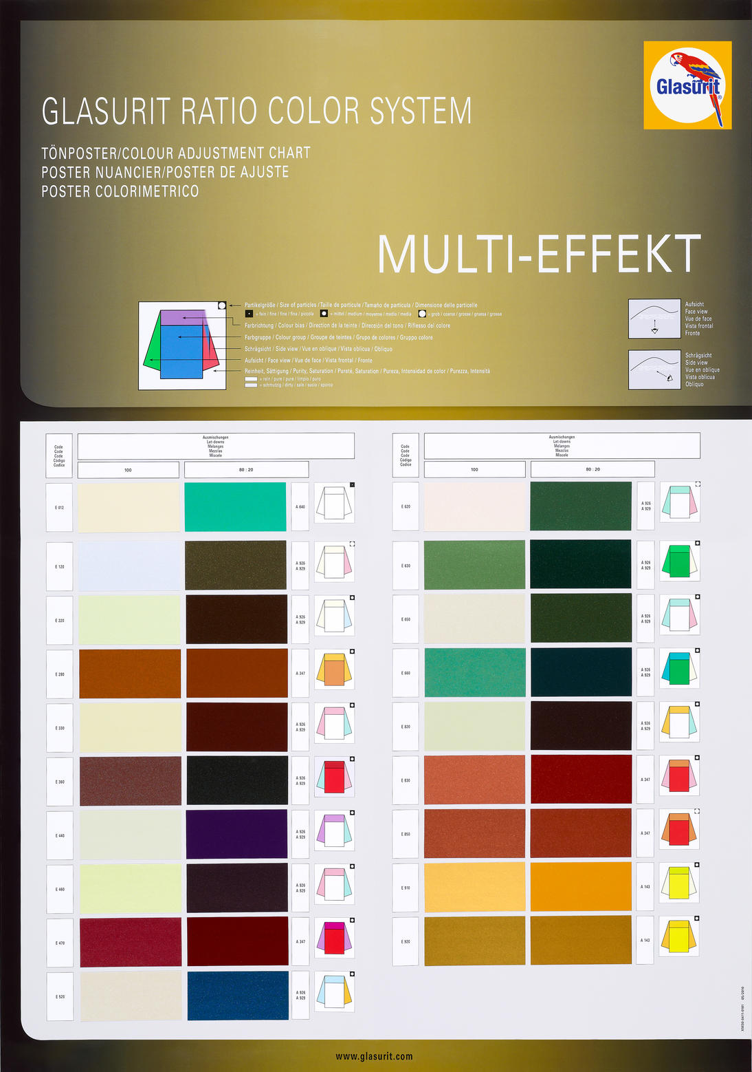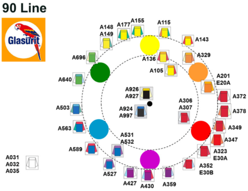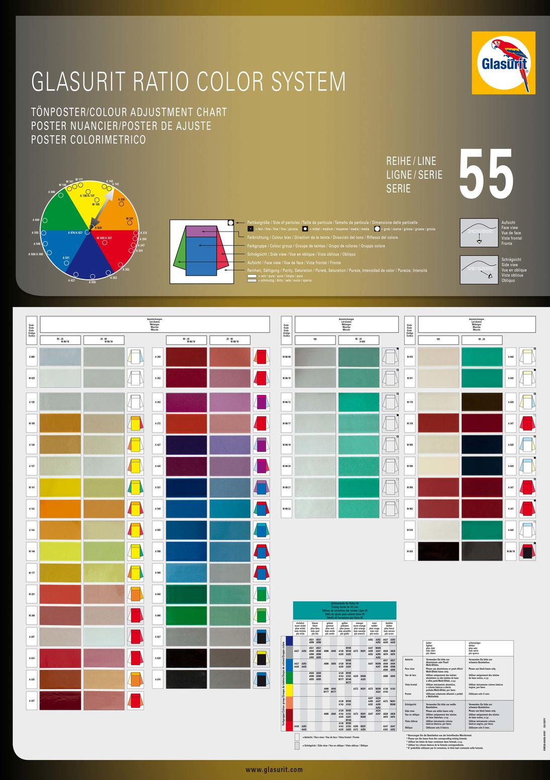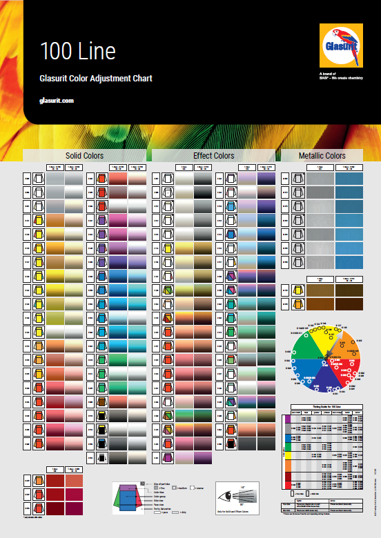 (Glasurit 100-M 1, 90-M 1 or 55-M 1) adjust the flip effect and the texture. In general adding or increasing the amount reduces sparkle and the flip effect. The color and the effect can change in the front view and side view. At the same time, the texture of the color becomes coarser.