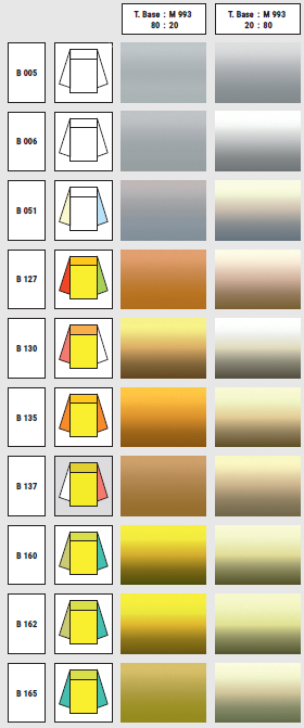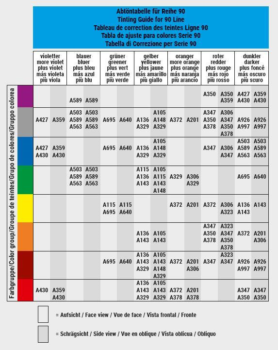 In addition, when selecting the mixing bases, you must consider their effect for the front and the side view. The pictograms and tinting guide tables in the color adjustment charts also provide you with clear indications of the tinting behavior of the individual mixing bases. Be sure to also consider the effect for the face view and for the side view.