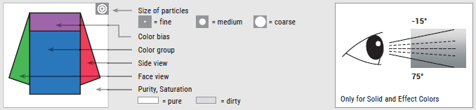 generally provide pure and transparent colors and are accordingly placed in the outer area of the color circle. They affect the color by preserving or increasing the purity of a color and they also adjust the chroma of the color. To evaluate the chroma, focus priority to considering the side view, because you will receive a better impression of the color. For the front view, the eye is irritated by the bright reflected light from the aluminum flakes, especially for bright colors.