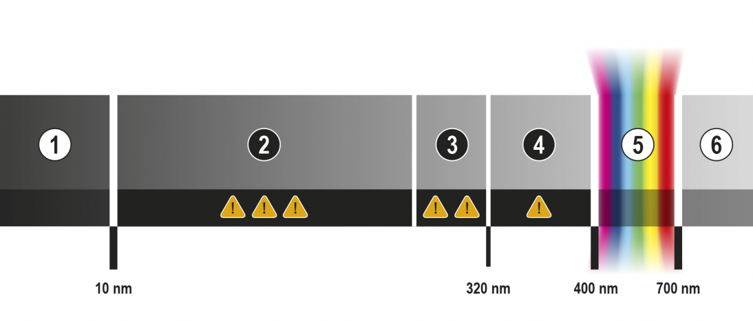 The wavelength range of spectral light is from 380 to 780 nanometres; (1) Gamma and X rays, (2) UV-C, (3) UV-B, (4) UV-A, (5) Light, (6) Infrared rays