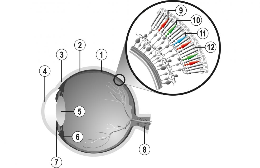 The human eye; (1) Retina, (2) Chorid, (3) Sclera, (4) Cornea, (5) Pupil, (6) Ciliary body, (7) Iris, (8) Optic nerve, (9) Long-wave cone, (10) Middle-wave cone, (11) Short-wave cone, (12) Rods