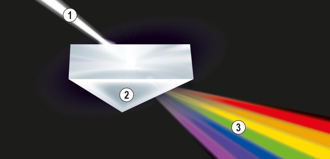 Prismatic spectrum of white light; (1) White light, (2) Prism, (3) Visible spectrum
