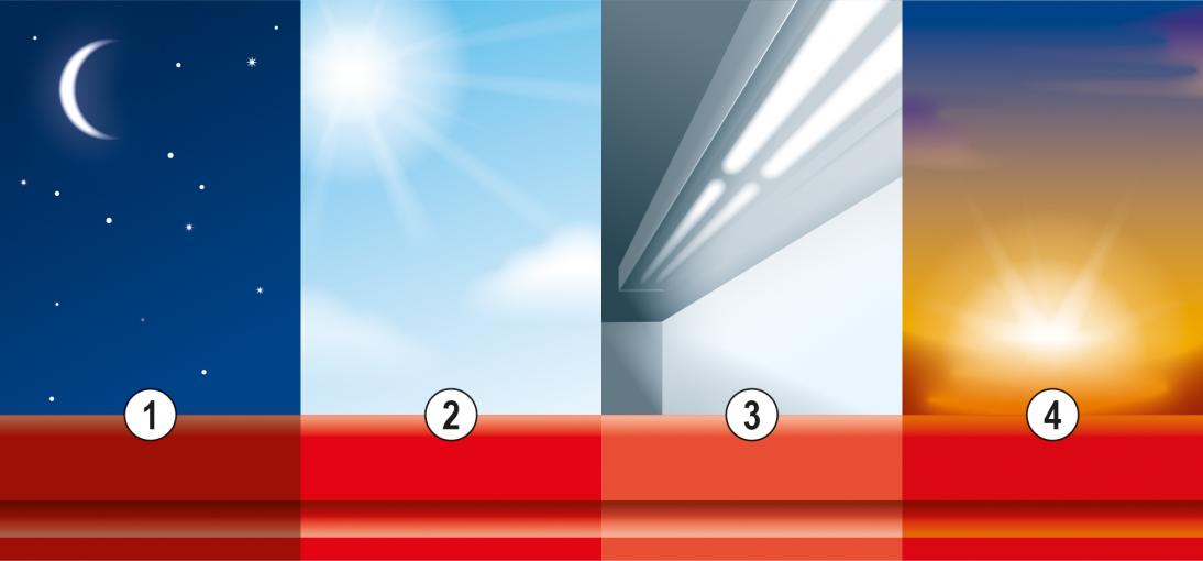 Influence of light on color perception; (1) Night, (2) Noon, (3) Fluorescent, (4) Sunset
