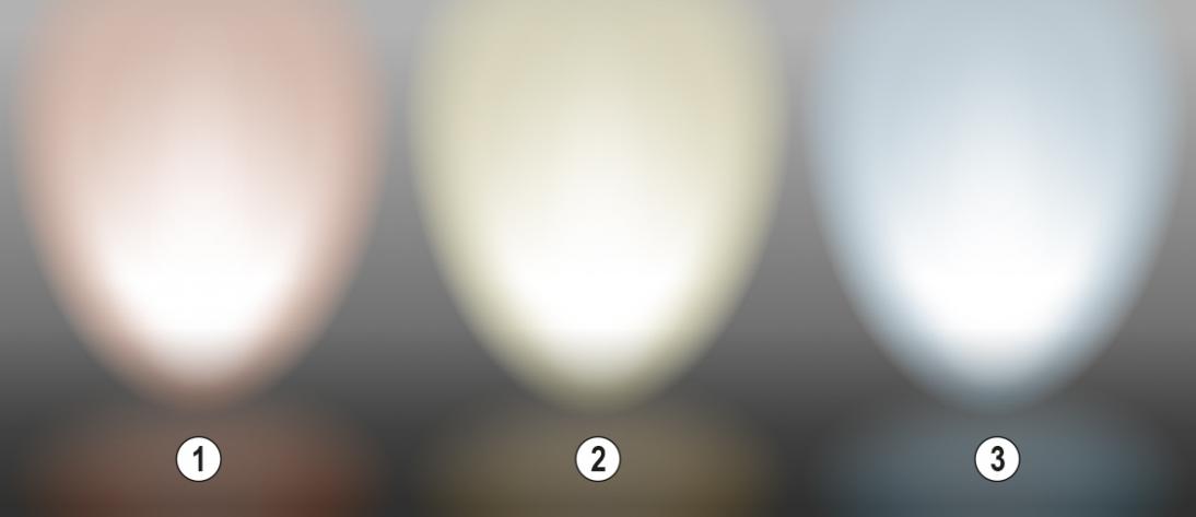 Various light sources and standardized light types for evaluating color; (1) 3000K - Warm white, (2) 4000K - Cool white, (3) 6500K - Daylight
