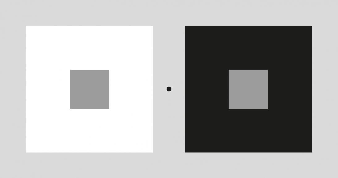 You will see that the small mid-gray square against the white background looks darker than the one against the black background, even though they have the same gray tone.
