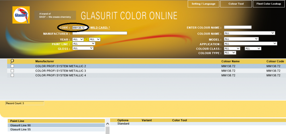 dropdown list of PAINT LINES, e.g., Glasurit 90 Line
