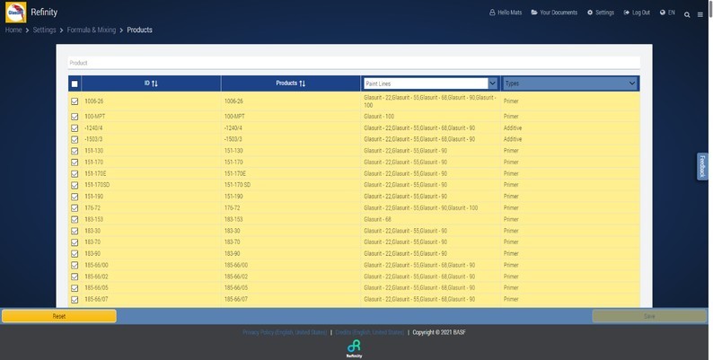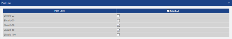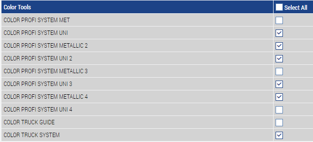 Sử dụng các hộp kiểm tra này để chọn các dòng sơn bạn sử dụng trong body shop của mình. Các dòng sơn bạn không sử dụng nên bỏ chọn; nếu không các công thức được sử dụng với các dòng sơn này sẽ hiển thị trong tìm kiếm màu.