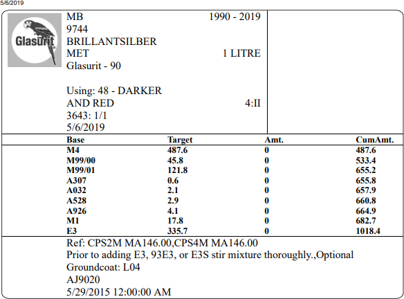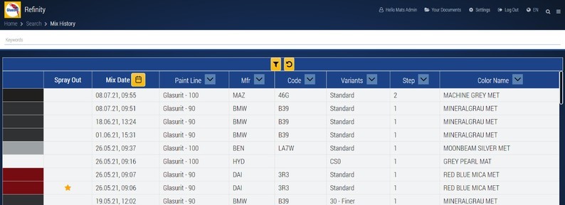 Nhập một từ khóa để rút gọn danh sách (nhà sản xuất, mã màu hoặc tên, ngày pha). Cột Sprayout cho biết rằng bạn có thẻ phun trong thư viện cá nhân của mình. Dễ dàng sử dụng các bộ lọc cho Ngày tháng, Đường vẽ, MFR, Mã, Biến thể, Bước hoặc Tên màu.