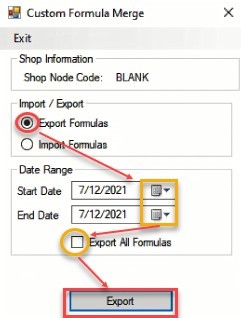 Một cửa sổ Hợp nhất Công thức Tùy chỉnh – “Merge Custom Formulas” sẽ xuất hiện. Chọn công thức xuất. Tiếp theo, chọn phạm vi ngày hoặc chọn "Xuất tất cả công thức" – “Export All Formulas” nếu bạn muốn xuất Tất cả. Cuối cùng chọn “Xuất”- “Export”