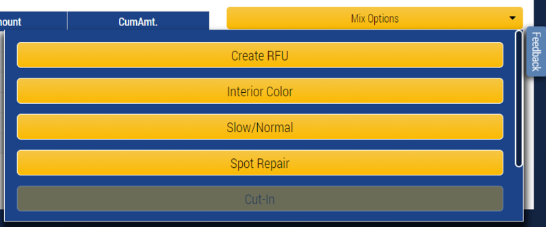 - Pha các tùy chọn: Tạo RFU, Màu nội thất, Chậm / Bình thường, Sửa điểm, Cắt công thức và điều chỉnh Matt / Gloss (xem chương bên dưới "Tùy chọn Pha" )