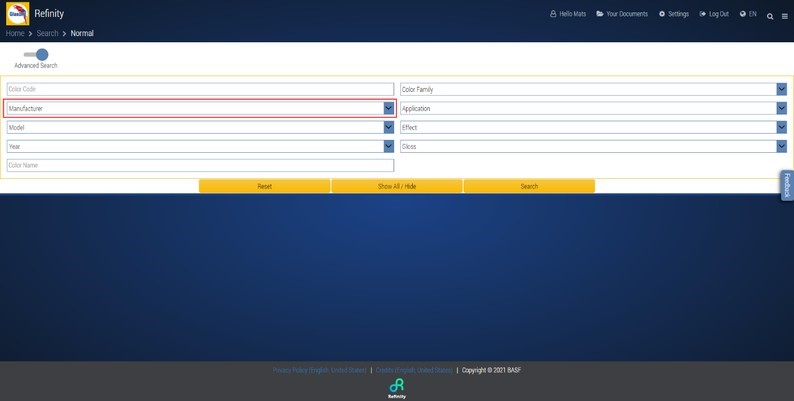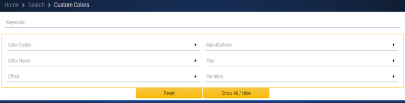 Một số mã màu có ở một số nhà sản xuất. Vì vậy, đối với một số tìm kiếm, hệ thống có thể cần thêm một số thông tin. Trong những trường hợp đó, vui lòng nhập thông tin bổ sung dưới nút chuyển đổi tìm kiếm nâng cao. Như là: