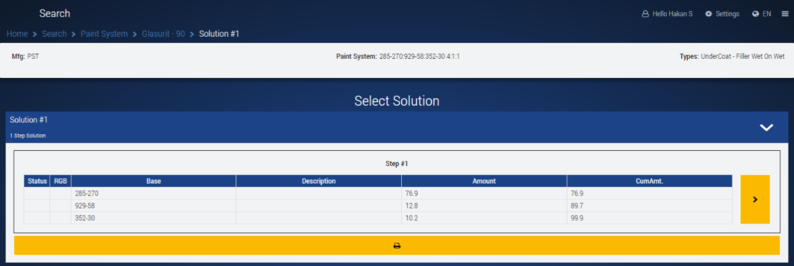 Tất cả những gì bạn cần làm là chọn sản phẩm bạn muốn pha và sau khi chọn xong, hệ thống sẽ đưa bạn đến trang lựa chọn giải pháp. Nhấp vào mũi tên để pha hoặc nhấp vào nút in để in công thức.