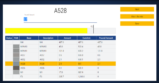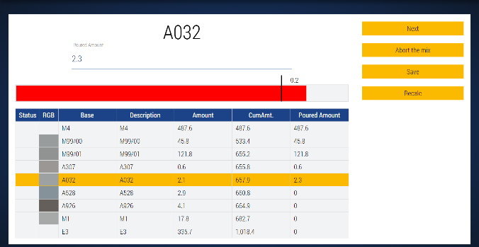 “Recalc Mix”: Công thức sẽ được tính toán lại, có tính đến sai sót. Khi kết thúc quá trình pha. Bạn có thể lưu công thức này dưới dạng công thức Tùy chỉnh.