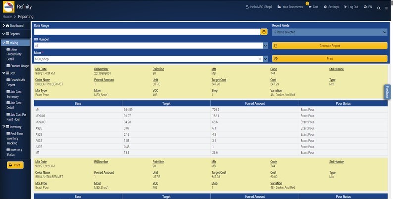 Báo cáo này dựa trên hỗn hợp sản phẩm và chứa nhiều chi tiết về hoạt động của quá trình pha sơn. Vì vậy, nếu bất kỳ ai làm quá nhiều hoặc hoạt động kém, chức năng này ngay lập tức ghi lại và thậm chí cung cấp cho bạn sự khác biệt về chi phí! Bạn có thể theo dõi tình trạng dư thừa, thiếu hụt, tính toán lại, v.v.