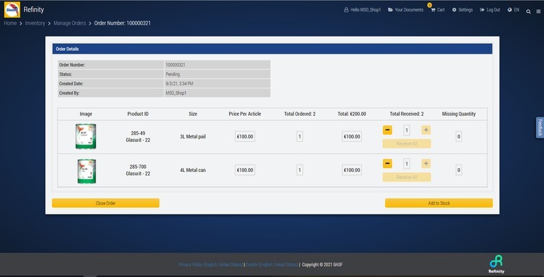 Bằng cách nhấp vào nút “Thêm vào kho”, hệ thống sẽ chuyển ngay tất cả số lượng đã nhận vào kho của bạn. Nếu thiếu bất kỳ sản phẩm nào, bạn luôn có cơ hội bổ sung số lượng đã nhận vào kho và giữ cho đơn hàng được mở. Sau khi bạn nhận được tất cả các sản phẩm, vui lòng nhấp vào “Đóng đơn hàng”. Hệ thống sẽ đóng đơn hàng và bạn không thể thực hiện bất kỳ thay đổi nào nữa.