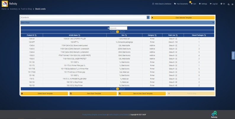 Tất cả các sản phẩm được liệt kê đều thuộc danh mục mà Nhà phân phối của bạn có và với tư cách là Body shop, bạn có thể quyết định bạn muốn mua những sản phẩm nào từ Nhà phân phối của mình. Chỉ những sản phẩm đã chọn mới hiển thị trong danh sách sản phẩm quản lý kho của bạn.